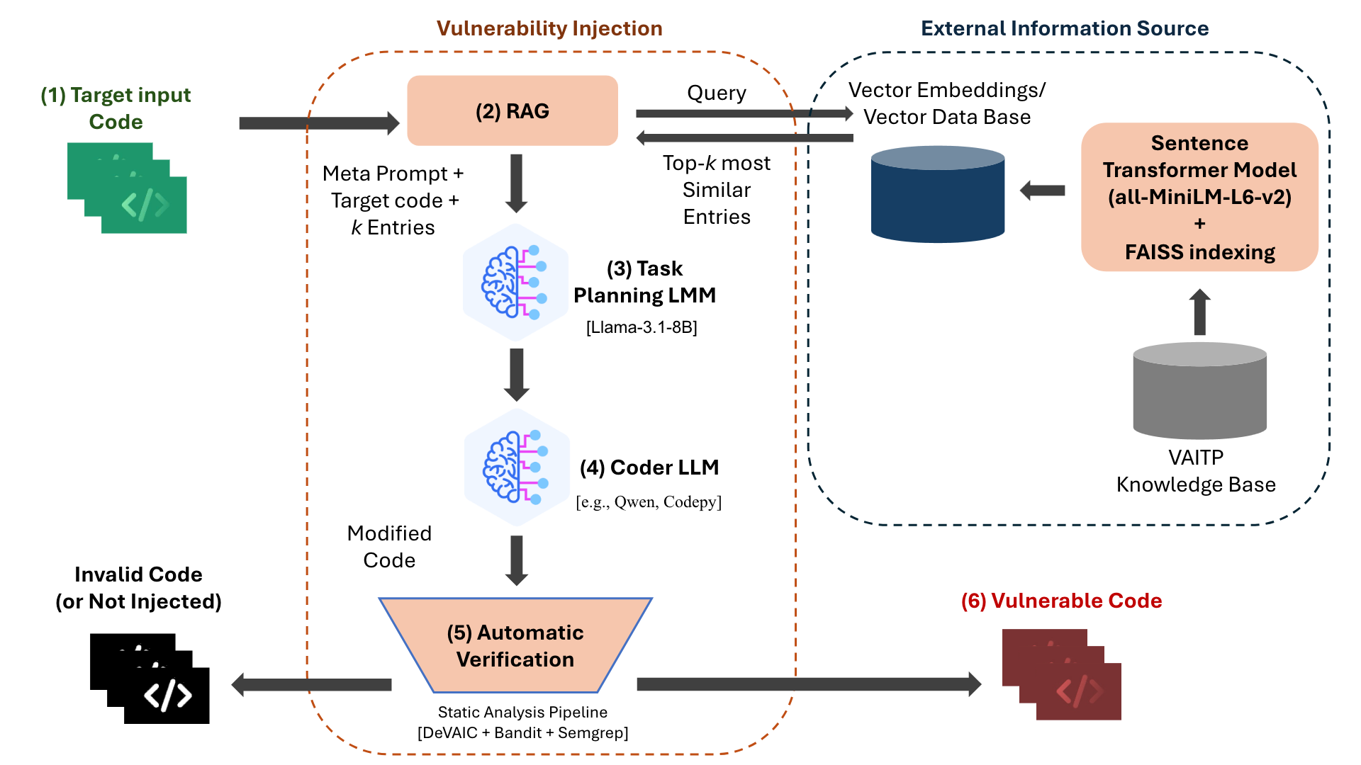 An overview of the VAITP framework pipeline, illustrating the multi-agent process from target code input (1) to the generation of statically-confirmed vulnerable code (6). The core of the architecture involves a Planner LLM that leverages RAG (2) to generate a meta-prompt (3) for a Coder LLM (4), with the final output validated by a multi-stage verification pipeline (5).